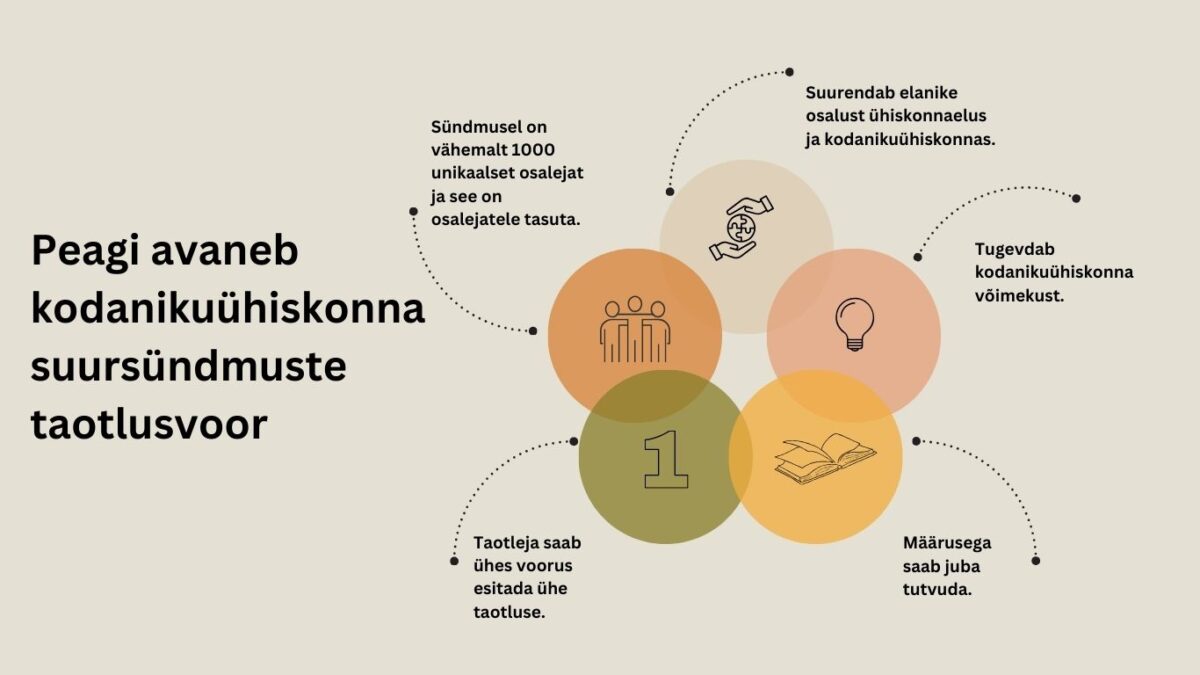 Toetuse eesmärk on aidata algatada ja jätkata mõjusaid suursündmusi, mis toetavad vabaühenduste koostööd ja võrgustikutööd ning kasvatavad kodanikuühiskonna nähtavust ja mõju kogu Eestis. Toetus sobib sündmustele, mis on avalikud, tasuta, toimuvad Eestis ning toovad kokku vähemalt 1000 osalejat.