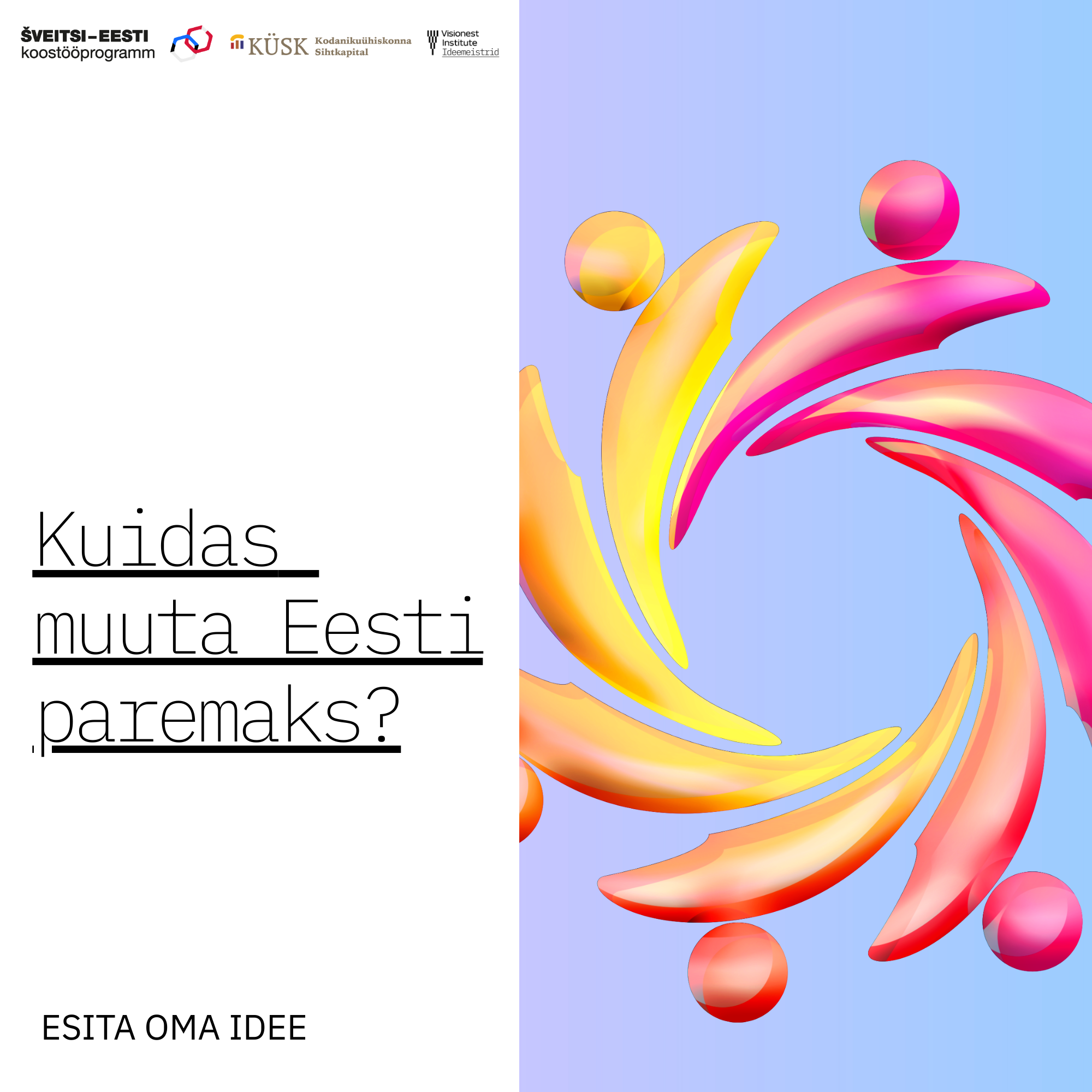 Programmi keskmes on Visionest Institute’i ellu viidav Ideemeistrite programm – algatus, mis annab võimaluse kõigile, kes märkavad ühiskonnas mõnd kitsaskohta ja tahavad sellele lahendust leida. Olgu selleks keeruline ligipääs kogukonnaelule, erinevate sihtrühmade vähene kaasatus või takistused lõimumisel – Ideemeistrid kutsuvad neid probleeme mitte ainult märkama, vaid ka lahendama.