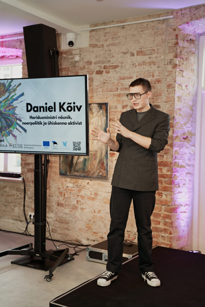 Päeva peaesineja oli haridus- ja teadusministri nõunik, noorpoliitik ja aktivist Daniel Kõiv (fotol), kes alustas oma ettekannet isikliku looga. Ta rääkis üleskasvamisest kakskeelses peres Lasnamäel, kolmest erinevast gümnaasiumist kolme gümnasistiks olemise aasta jooksul ja 13 päevast, mil istus koroonapandeemia tuules Toompeal plakatiga “Mask on seksikas!”, ja samuti sellest, kuidas ta Jaan Poska gümnaasiumi lõpuklassist otse ministri nõuniku ametisse sattus.